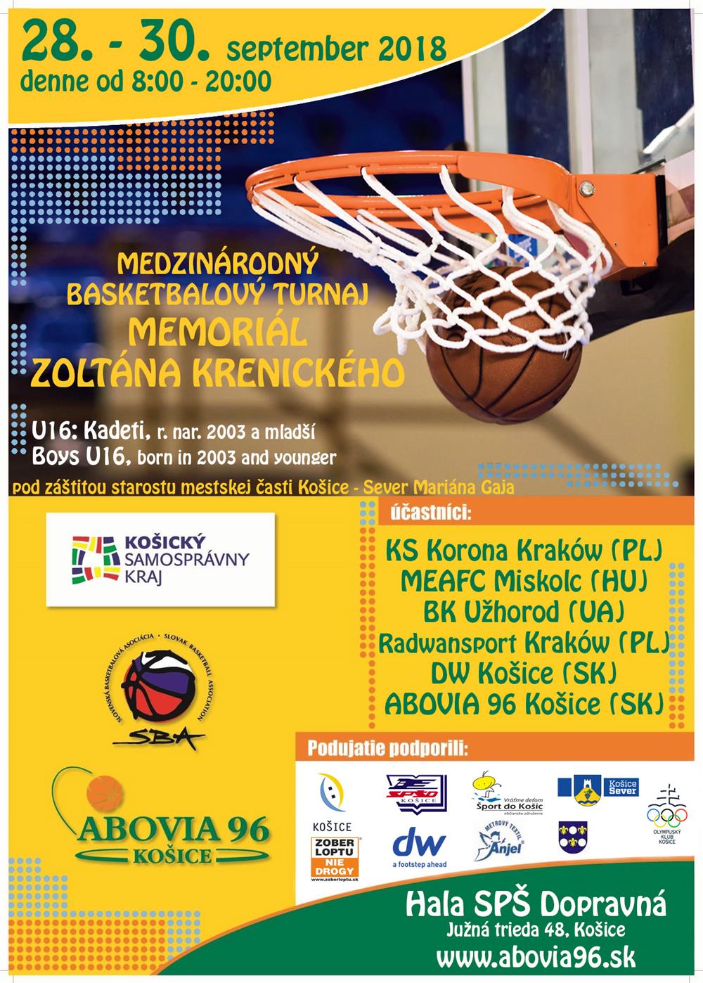 V Košiciach sa uskutoční od 28. do 30. septembra ďalší ročník medzinárodného basketbalového turnaja Memoriál Zoltána Krenického. V hale SPŠ Dopravná sa predstaví v kategórii "U16" šesť družstiev zo štyroch krajín.